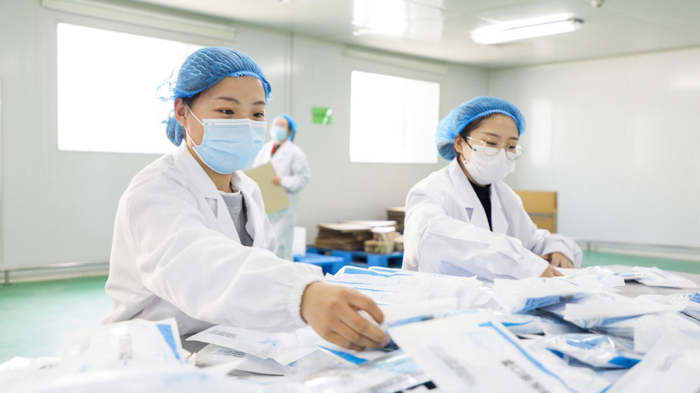 ↑河北安國現(xiàn)代中藥工業(yè)園區(qū)內(nèi)工作人員正在包裝生產(chǎn)的保障口罩。于子涵 攝