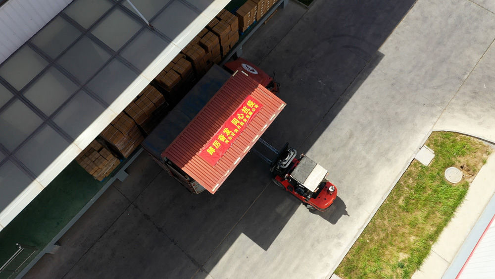 ↑河北安國現(xiàn)代中藥工業(yè)園區(qū)內(nèi)工作人員正在把捐贈(zèng)的防疫物資裝車。于子涵 攝